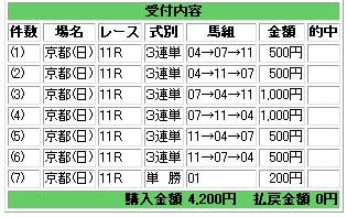 7.ディープインパクトははずせないので、絡めて3連単ボックス買い。1.コンラッドは、「今日からマ王」ってアニメ(原作読んでません)の登場人物なのでご祝儀。決戦は15時40分!!