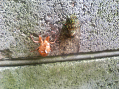 抜け殻と一緒に塀にへばりついてて、近寄ってもまったく逃げませんでした。まだ飛べなかったのでしょう。