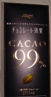 で、チョコレート効果99%。騒ぐほど苦くないと思う。ちょっと渋いかもだけど。でも、美味いか?と聞かれたら、美味しいとは思えない。まあ、ポリフェノールいっぱいで、体にいいかもってことで。